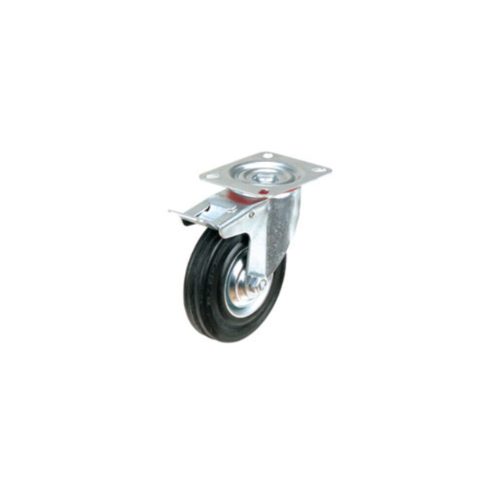 Roată industrială pivotantă cu frână cu rulment cu role, bandaj din cauciuc negru, furcă și flanșă din oțel.