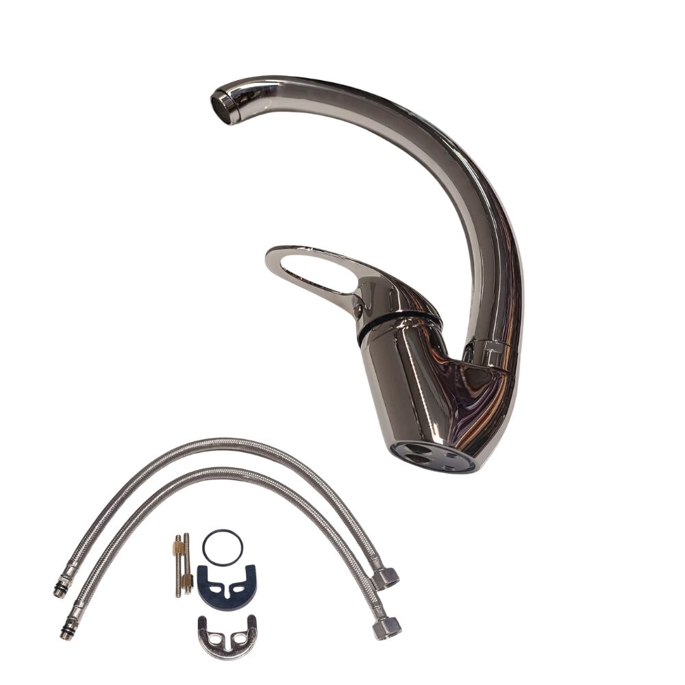 Echipată cu componente de calitate: aerator din inox, pipă din inox, furtun flexibil 1/2” × 45 cm, piulițe și capace din alamă, șurub din inox.