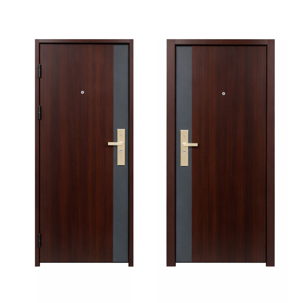 Ușă metalică de intrare destinată apartamentelor sau caselor, realizată din oțel rezistent, cu design modern și finisaj în culoare nuc. Suprafața este netedă și decorată cu linii elegante pe ambele părți, oferind un aspect estetic plăcut și contemporan.