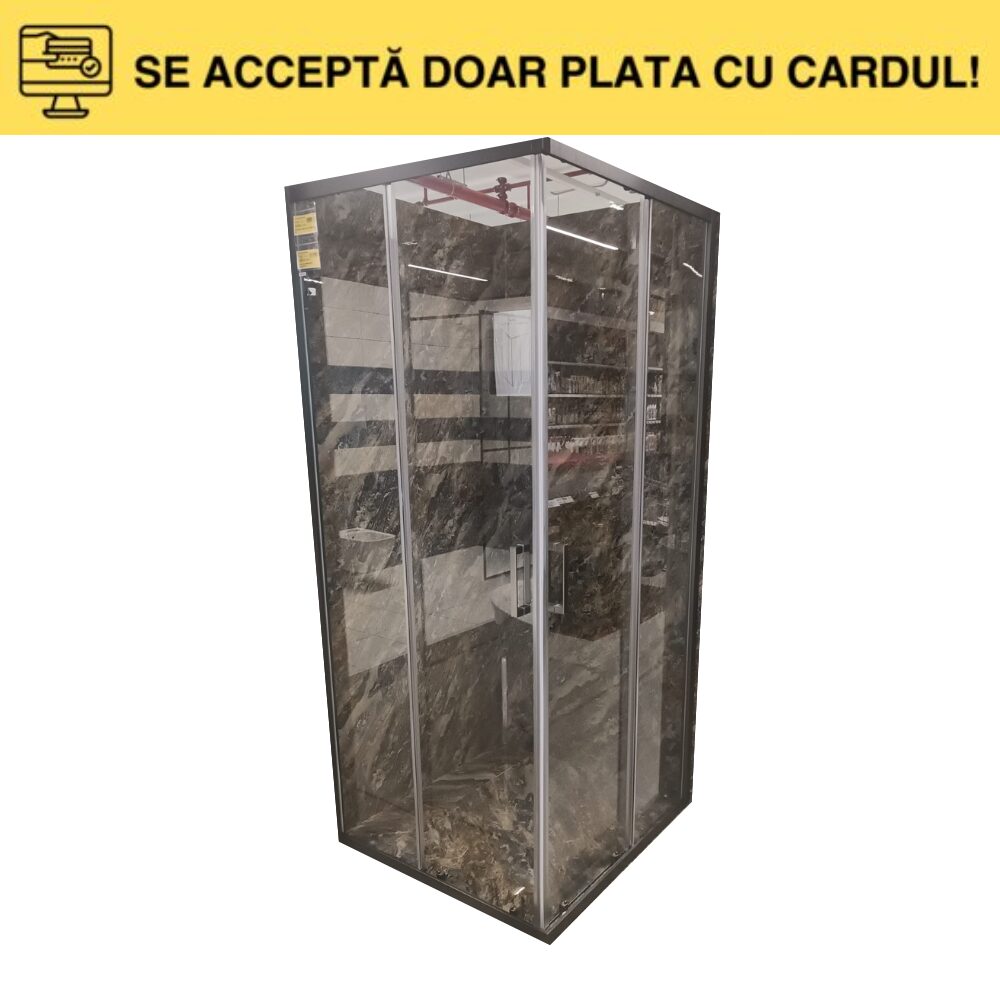 Cabina de duș este realizată cu sticlă securizată (transparentă) de 8 mm, cadru din aluminiu (culoare gun metal), mânere din oțel inoxidabil, ghidaj inferior cu montaj facil și role cu arc ușor de întreținut, asigură deschiderea și închiderea ușoară, confort și durabilitate.