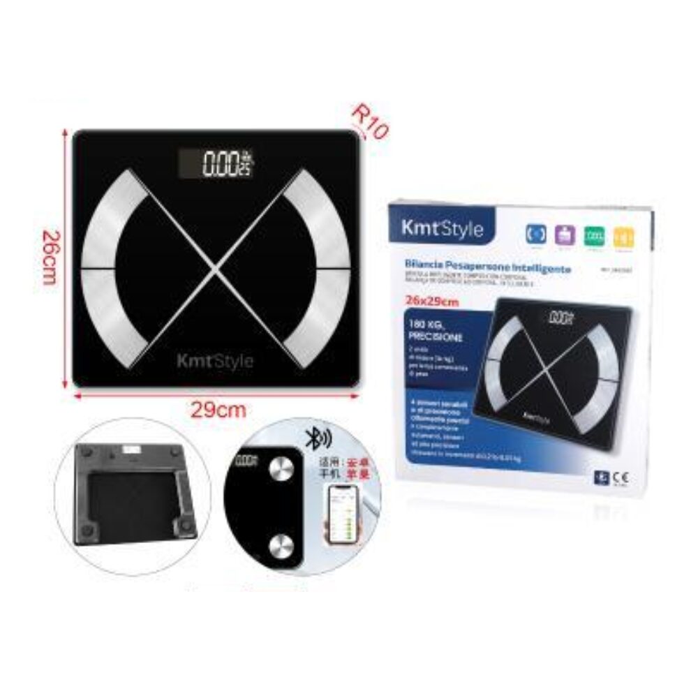 Cântar inteligent ("smart scale"), cu conectivitate Bluetooth. Afișează procentul de grăsime corporală (0.00% vizibil pe ecran) și alte date despre starea corpului prin intermediul unei aplicații dedicate. Suprafață din sticlă neagră cu elemente de design argintii.