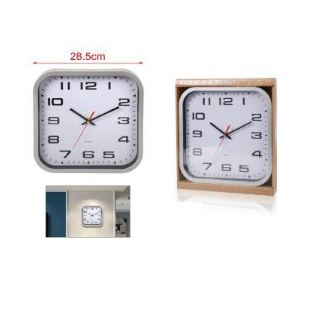 Ceas de perete pătrat din plastic, de culoare argintie, cu mecanism silențios.