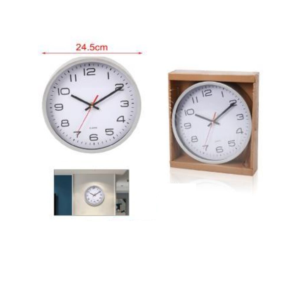 Ceas de perete rotund, de culoare argintie, cu ramă lată și rotundă din plastic și cu mecanism silențios, .