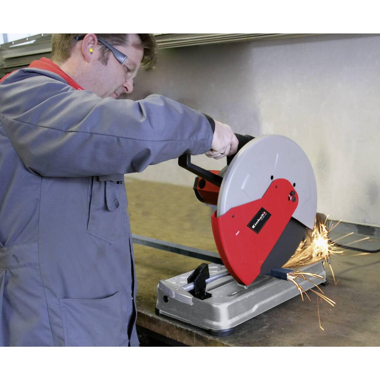 Mașina de tăiat metal Einhell TC-MC 355 este unealta ideală pentru tăierea, tăierea și separarea metalelor de diferite grosimi ușor și eficient. Fie că sunt țevi, tije plate, rotunde și profilate din fier, aluminiu și metale neferoase: Cu o putere de 2300 de wați și o viteză de 4000 de rotații pe minut, mașina de tăiat metale este ideală pentru utilizare în atelierul de hobby sau garaj . Este echipat cu o rulare moale pentru a proteja mecanica de cupluri excesive. Opritorul reglabil pe înălțime permite reglarea precisă a înălțimii de tăiere. Fixarea pânzei de ferăstrău asigură o schimbare în siguranță a pânzei de ferăstrău. Discul de tăiere cu un diametru de 355 pe 25,4 pe 3,2 milimetri poate fi utilizat în mod optim. Clema cu mecanism de blocare rapidă permite tăieturi în unghi de la -15 grade la 45 de grade. Un deflector de scântei protejează mediul împotriva scânteilor strălucitoare. Mașina de separare a metalelor Einhell este echipată cu un suport pentru scule pentru cheia hexagonală furnizată, precum și un încuietoare de transport și un mâner suplimentar pentru transport.