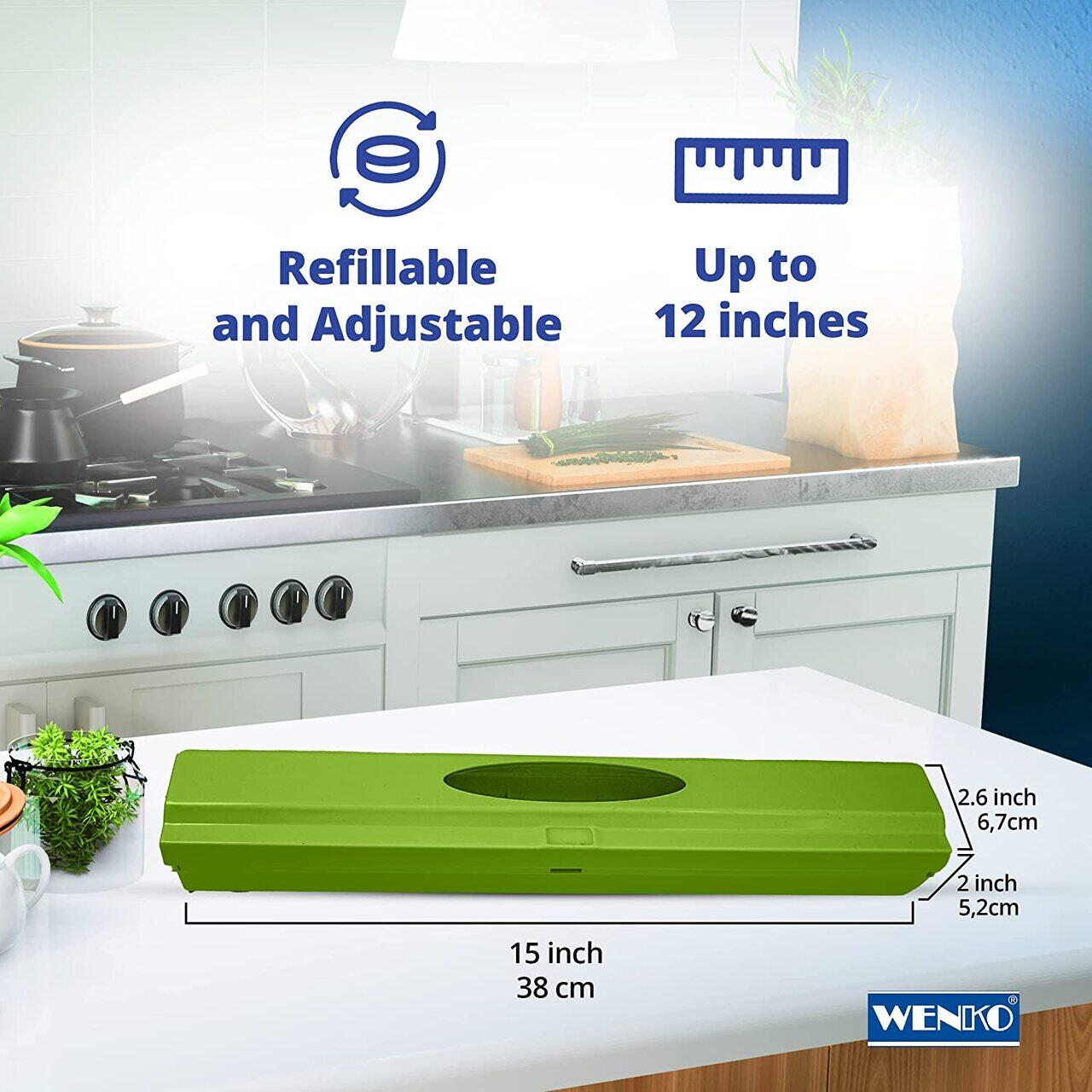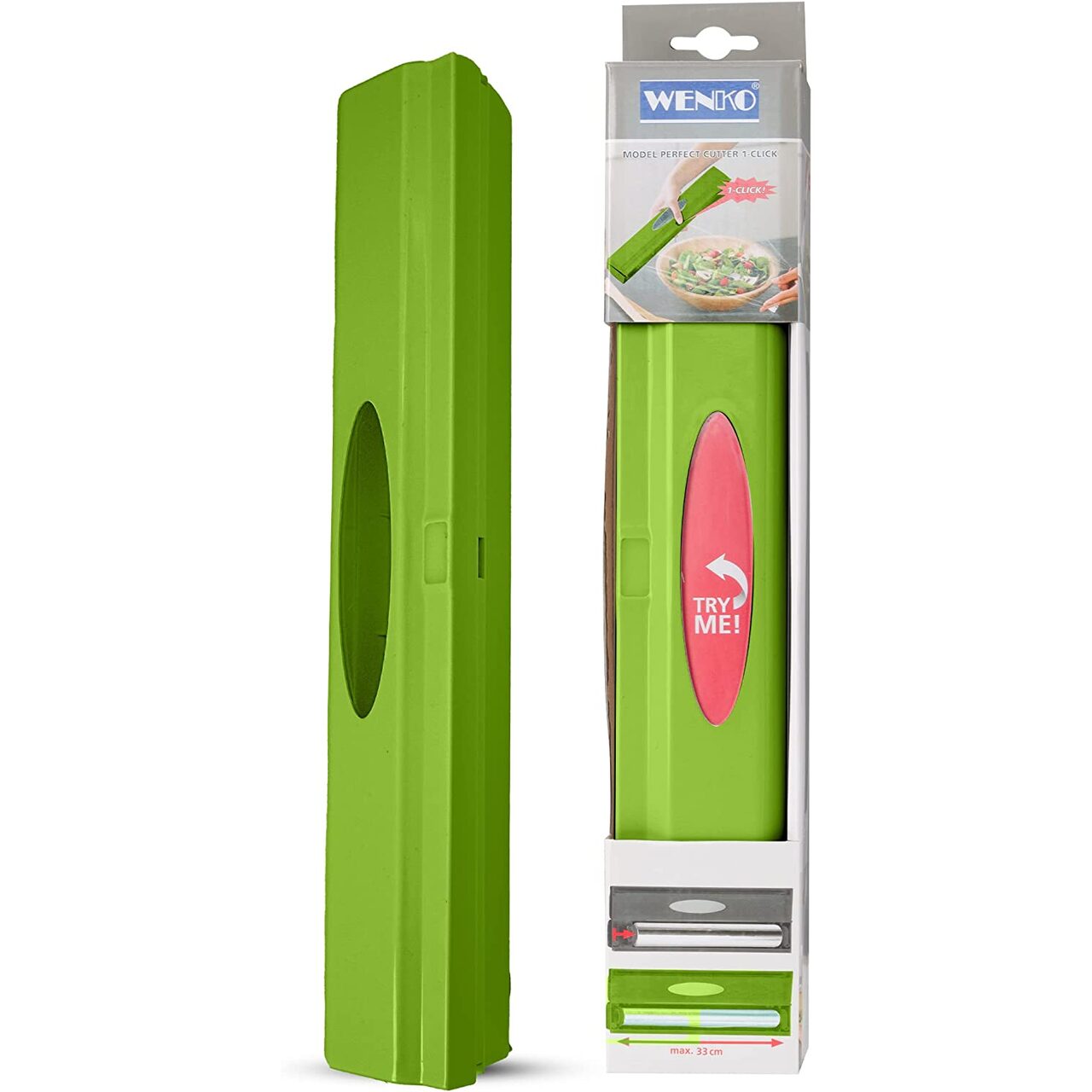 Suport practic pentru role pentru folii de aluminiu și folii alimentare. Opțiune ideală de depozitare pentru role cu o lățime de până la 33 cm. Cu o lamă din oțel inoxidabil, rezistentă la rugină, dinți fin. În verde elegant, cu o fereastră de vizualizare.