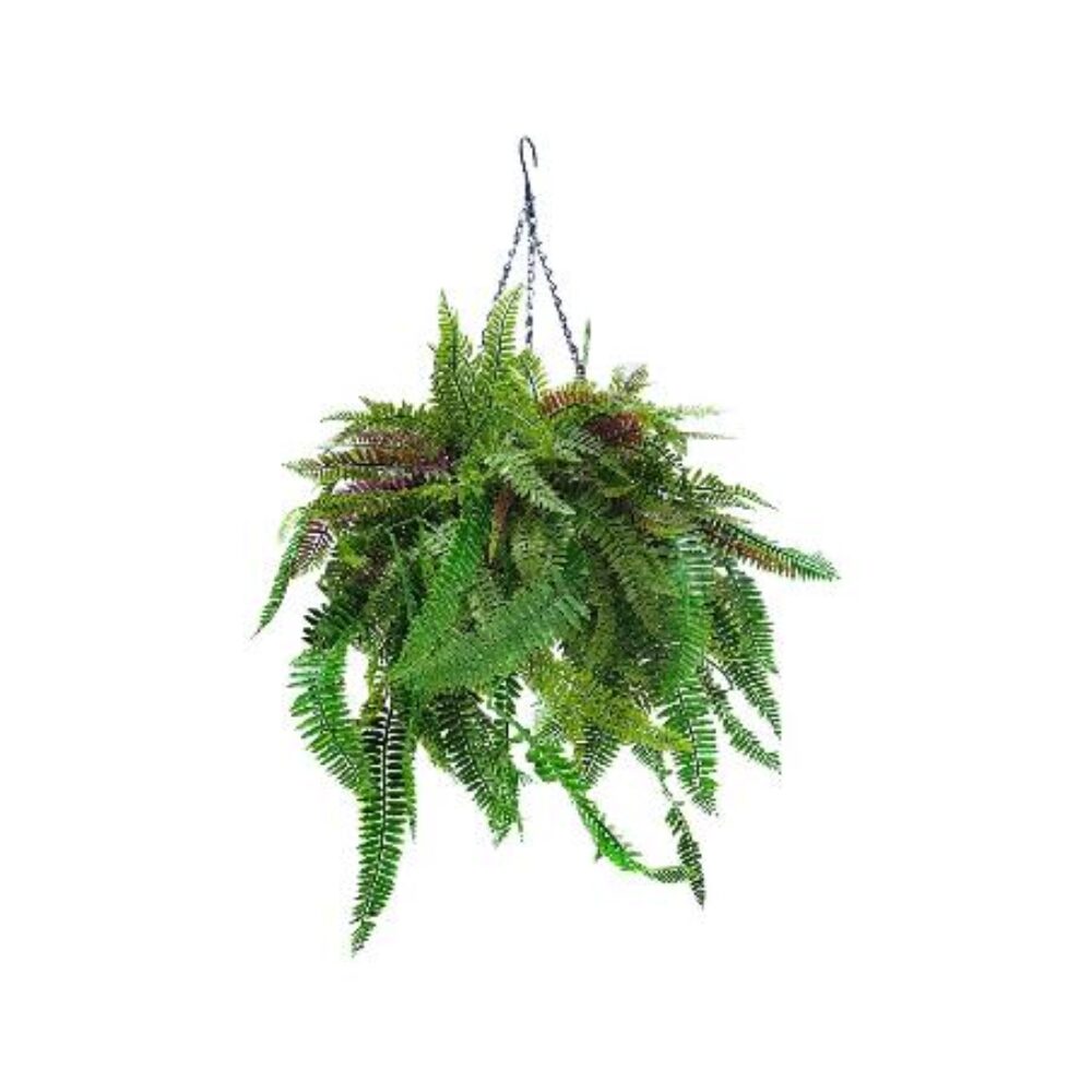 Ghiveci suspendat decorativ cu plantă artificială tip ferigă, cu aspect natural, potrivit pentru interior și exterior.