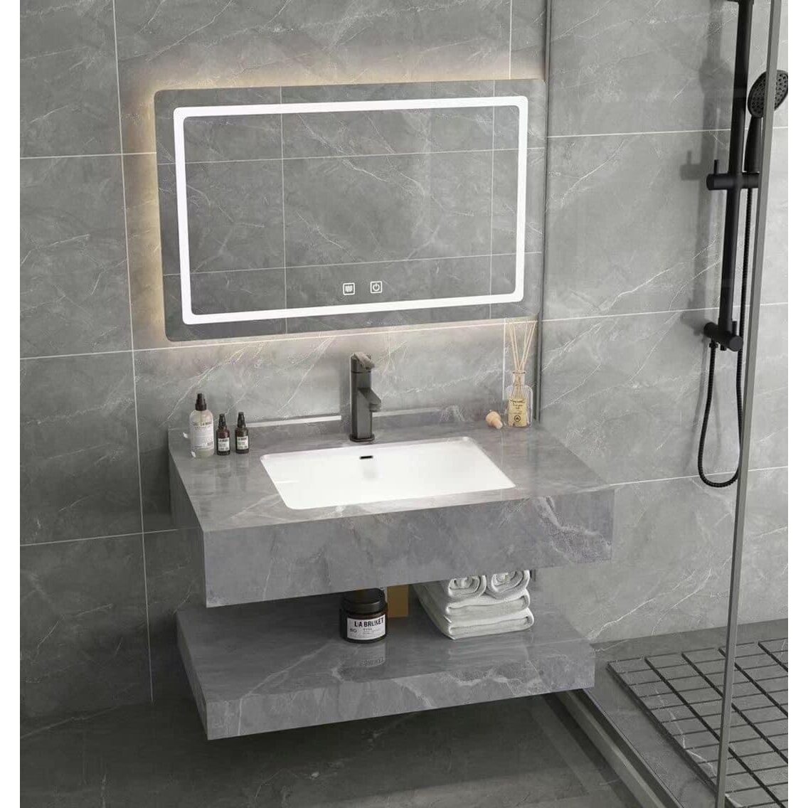 Lavoar si raft inferior ceramice. Oglindă LED cu comutator tactil și funcție anti-ceață, oglindă fără cupru T4mm, standard Europa.