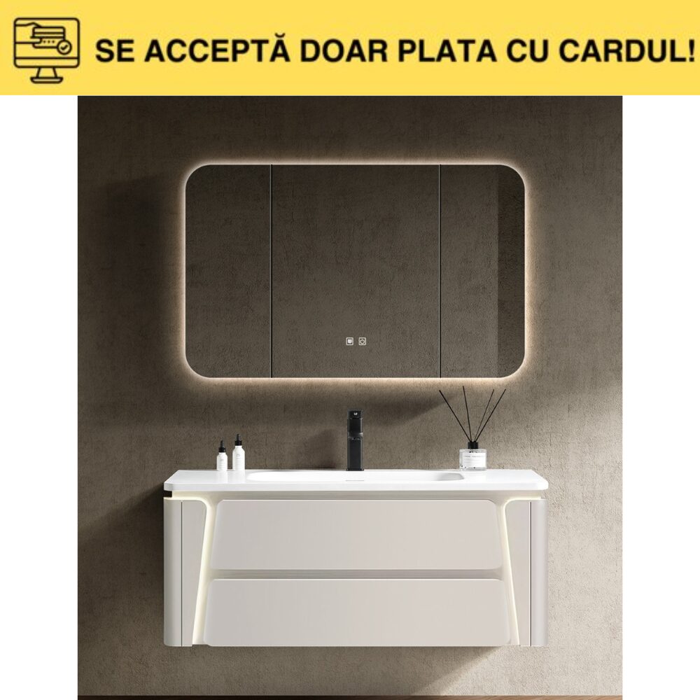Set mobiler baie modern și elegant, compus din dulap PVC cu lavoar ceramic, materiale de înaltă calitate, durabil și ușor de întreținut și o oglindă cu iluminare LED integrată, ideal pentru băi moderne.