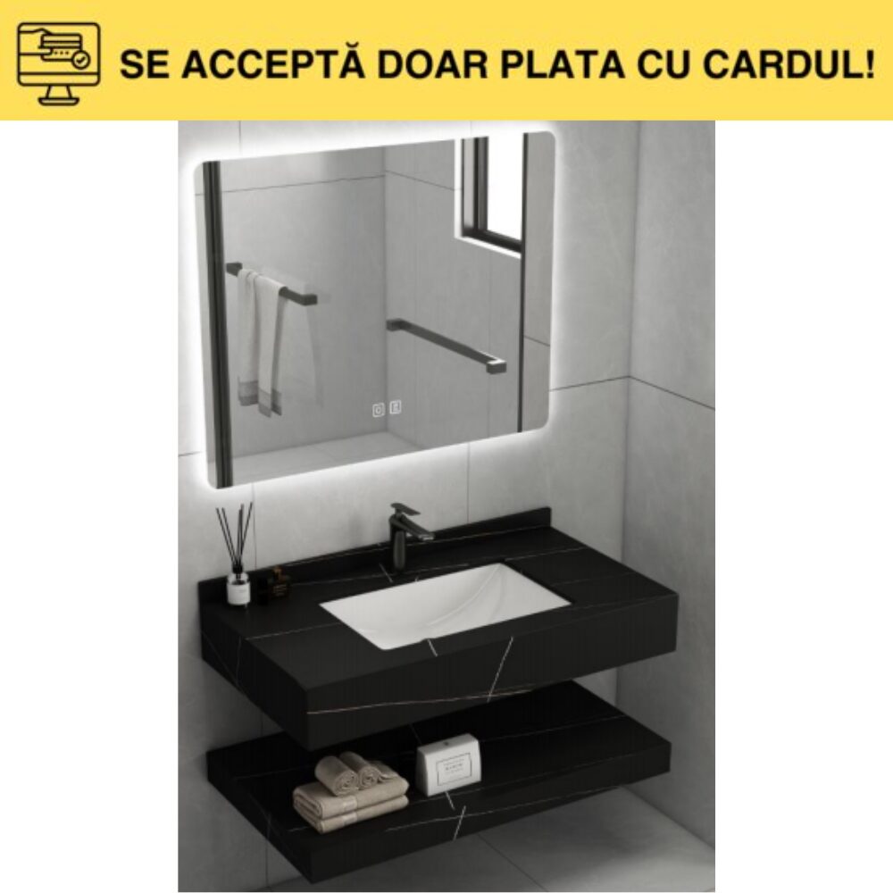 Blatul din piatră sinterizată oferă rezistență ridicată la uzură și un aspect premium. Lavoarul încastrat permite utilizarea eficientă a spațiului, iar oglinda cu iluminare LED și senzor tactil adaugă confort și modernitate băii tale.