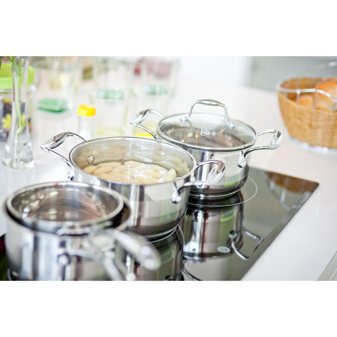 Oala Primo de înaltă calitate este fabricată din oțel inoxidabil. Capacul din sticlă transparentă vă permite să vizualizați conținutul în timp ce gătiți. Fixat exact și lipit de tigaie, vă permite să optimizați timpul de gătire. Există o cană practică de măsurat în interiorul oalei. Baza capsulei acumulatoare de căldură garantează o distribuție uniformă a căldurii, ceea ce permite gătitul cu o cantitate mică de apă, păstrând astfel vitaminele valoroase în preparatele gătite. Poate fi folosit pe toate aragazele, inclusiv pe cele cu inducție. Potrivit pentru spălare în mașina de spălat vase.