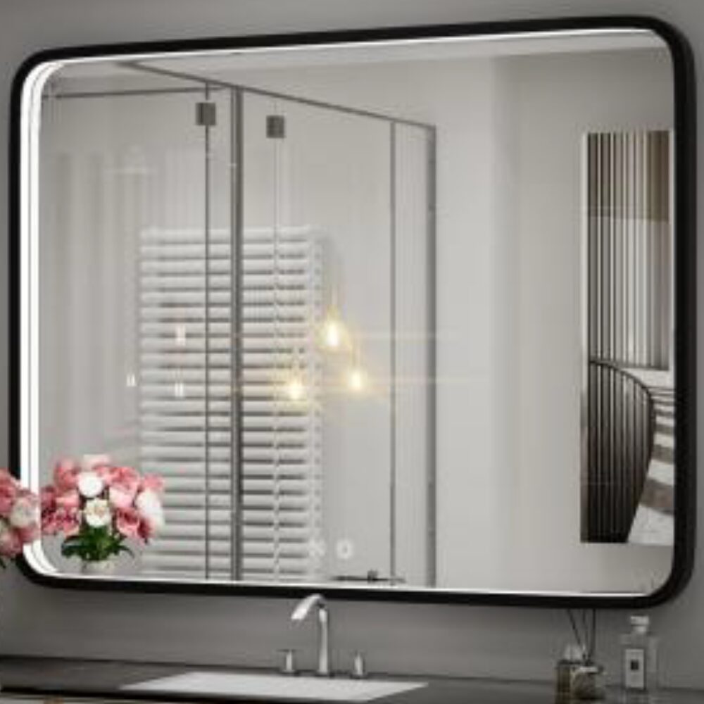Oglindă subțire, 5 mm grosime, cu ramă elegantă din aluminiu negru și cutie pentru cablu integrată pentru un aspect modern și organizat. Dispune de doi senzori tactili pentru control intuitiv și funcție de dezaburire. Iluminare LED alb rece (4500K) pentru vizibilitate optimă.