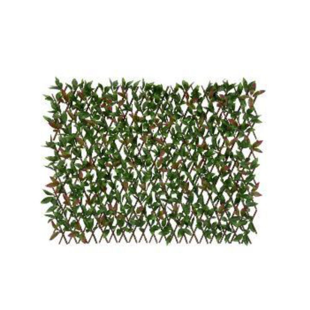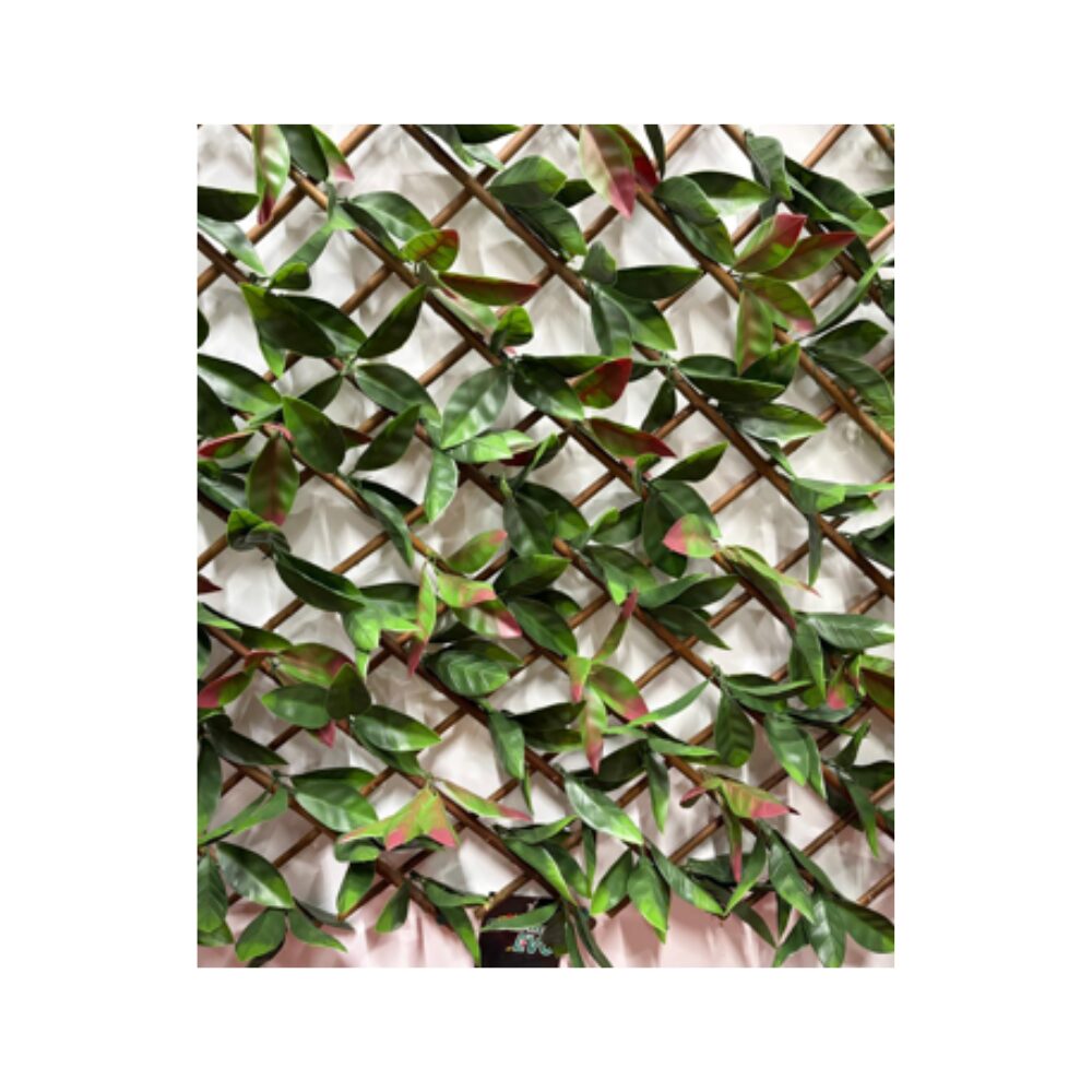 Gard extensibil decorativ din răchită naturală, cu frunze artificiale tip Photinia, potrivit pentru interior și exterior. Ideal pentru mascarea pereților sau a gardurilor.