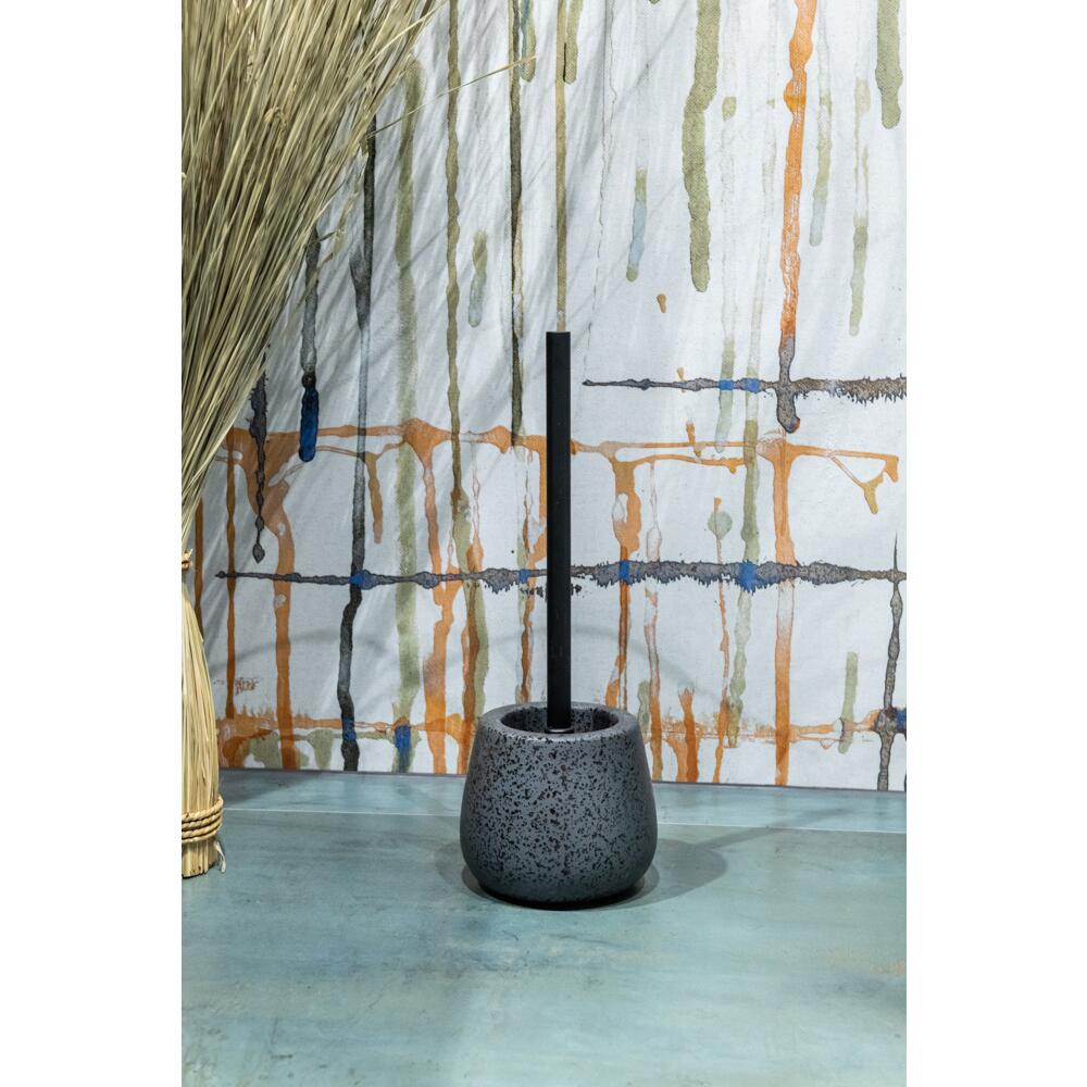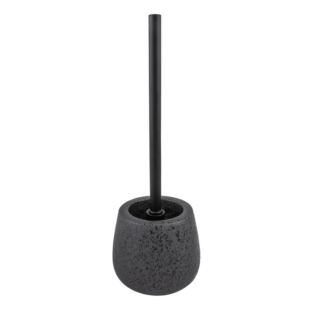 Perie de toaletă din seria Hades. Recipientul este realizat din gresie inchisa, mata, antracit. Manerul periei este din otel vopsit in negru mat. Diametrul ariciului este de aproximativ 7,5 cm.
