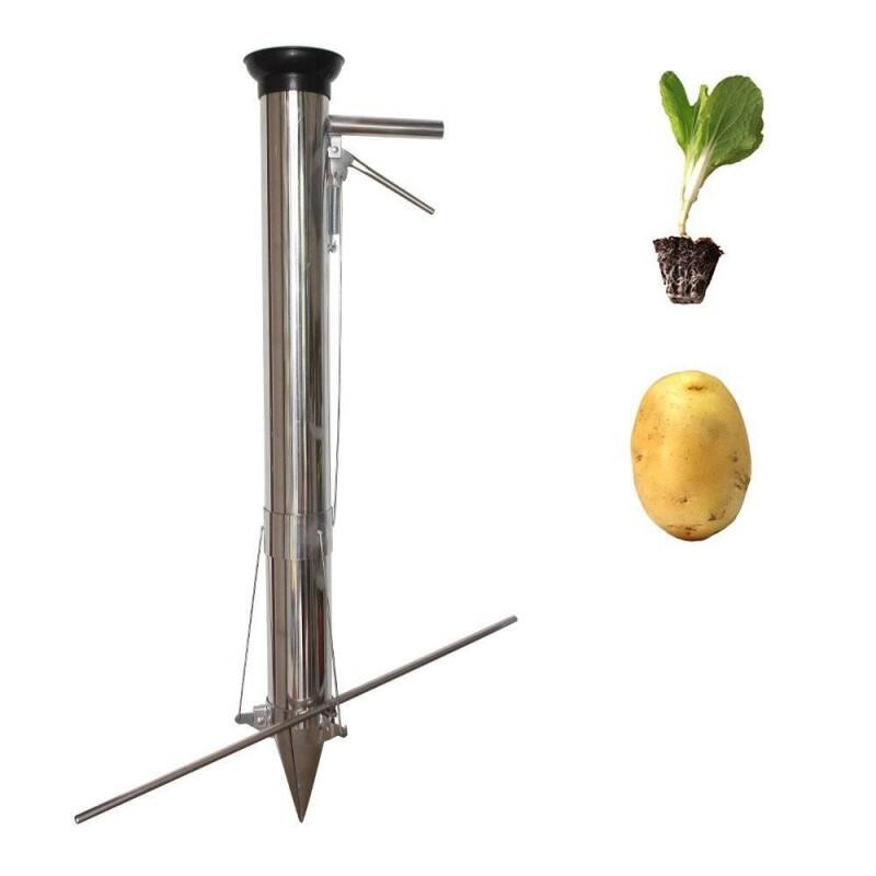 Plantator manual pentru rasaduri din material inoxidabil cu tub de directionare si o supapa care automatizeaza procesul de plantat rasaduri.Rasadurile se pot planta la adancime precisa cu ajutorul dopului de limitare, iar distanta dintre plante pe rand este definita prin ajutorul markerului si variaza de la 5 la 50 cm.Se foloseste pentru plantarea rasadului de rosii, ardei, pepene galben si rosu, cartofi precum si seminte mari.Este realizat din aliaj de metal, foarte rezistent, poate fi operat cu o singura mana. Avantajul fata de plantatoarele de fier consta in greutatea redusa care permite unei singure persoane sa planteze o suprafata mai mare.Are tija pentru a tine randurile la distanta egala.Ofera o viteza mare de plantare, inlocuind munca a 4 oameni.Avantaje plantatorul rasaduri, inox, Micul Fermier GF-0132: