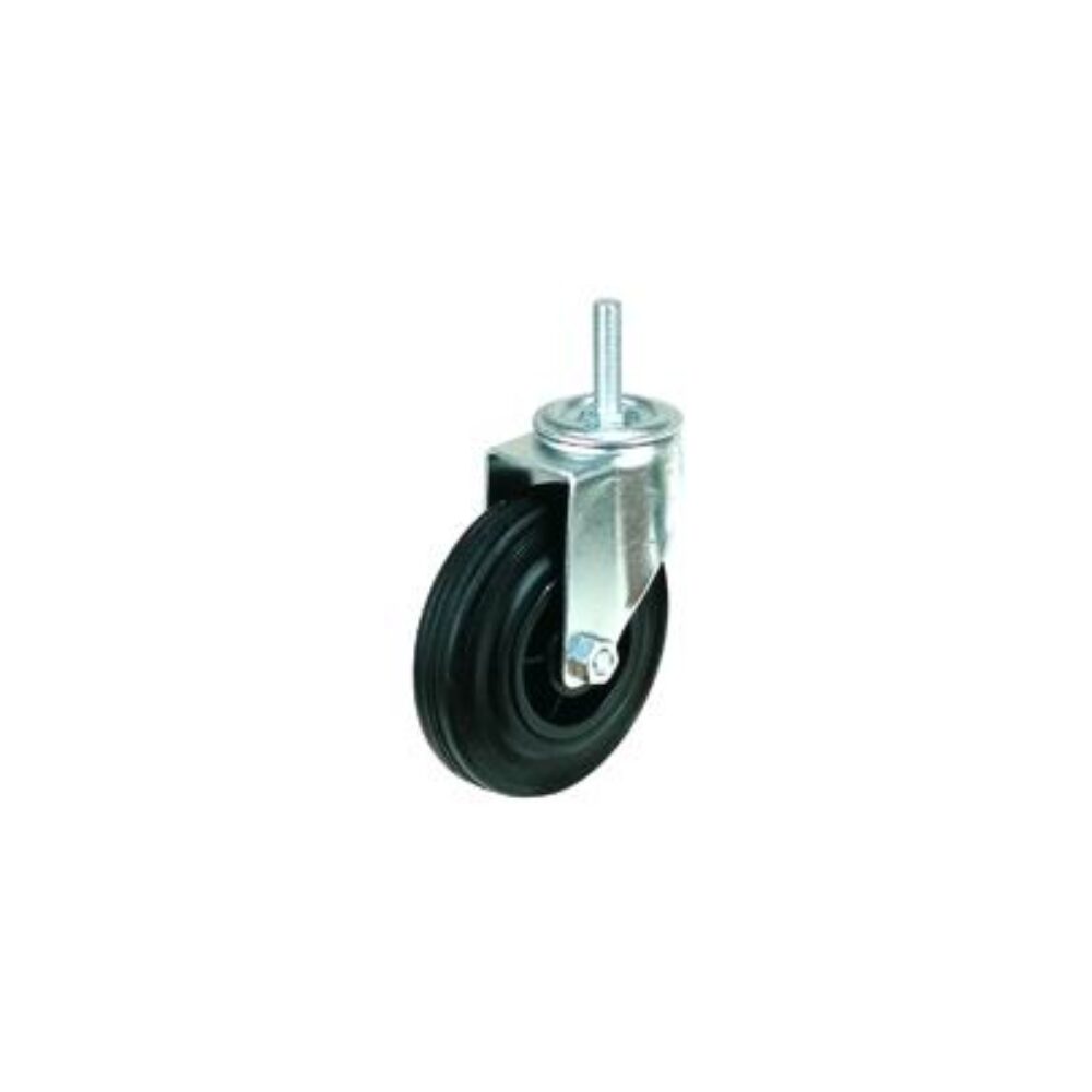 Roată industrială pivotantă șurub, cu miez din plastic, bandaj din cauciuc negru, furcă și flanșă din oțel.