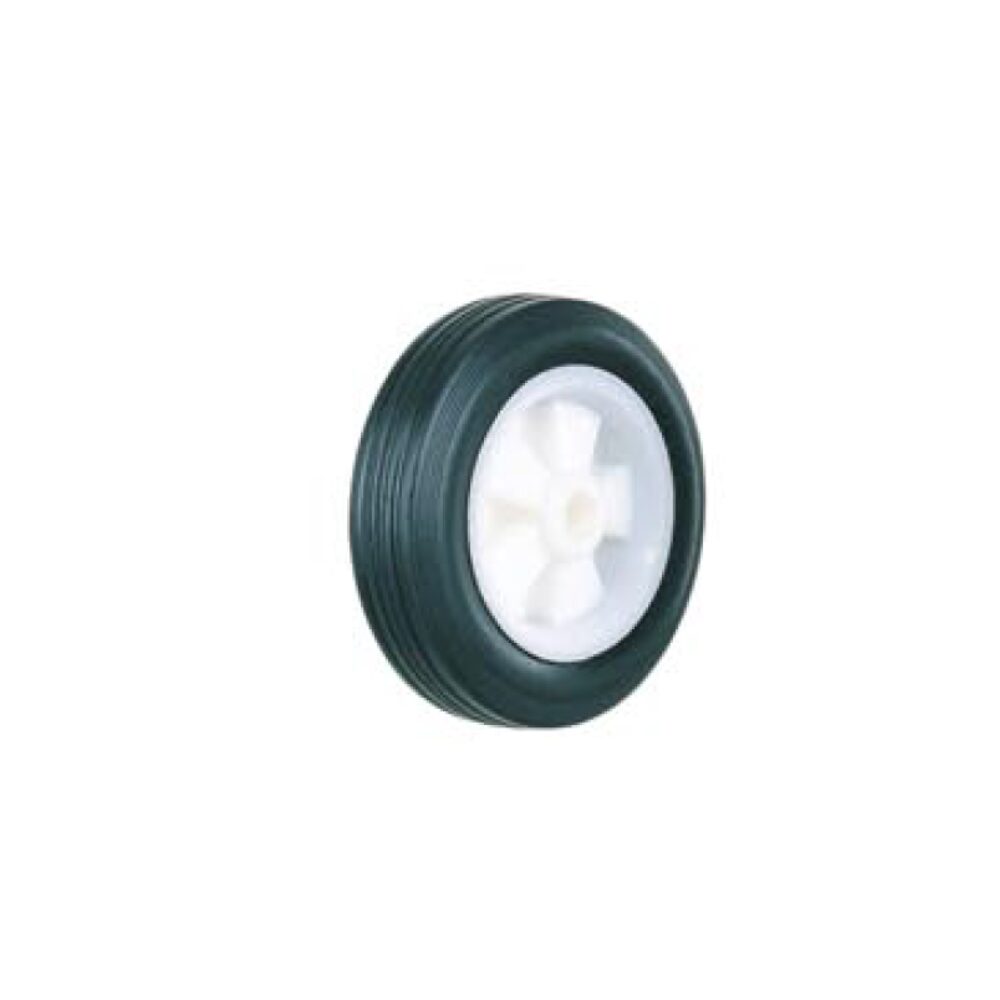 Roată din cauciuc negru cu miez din plastic.
