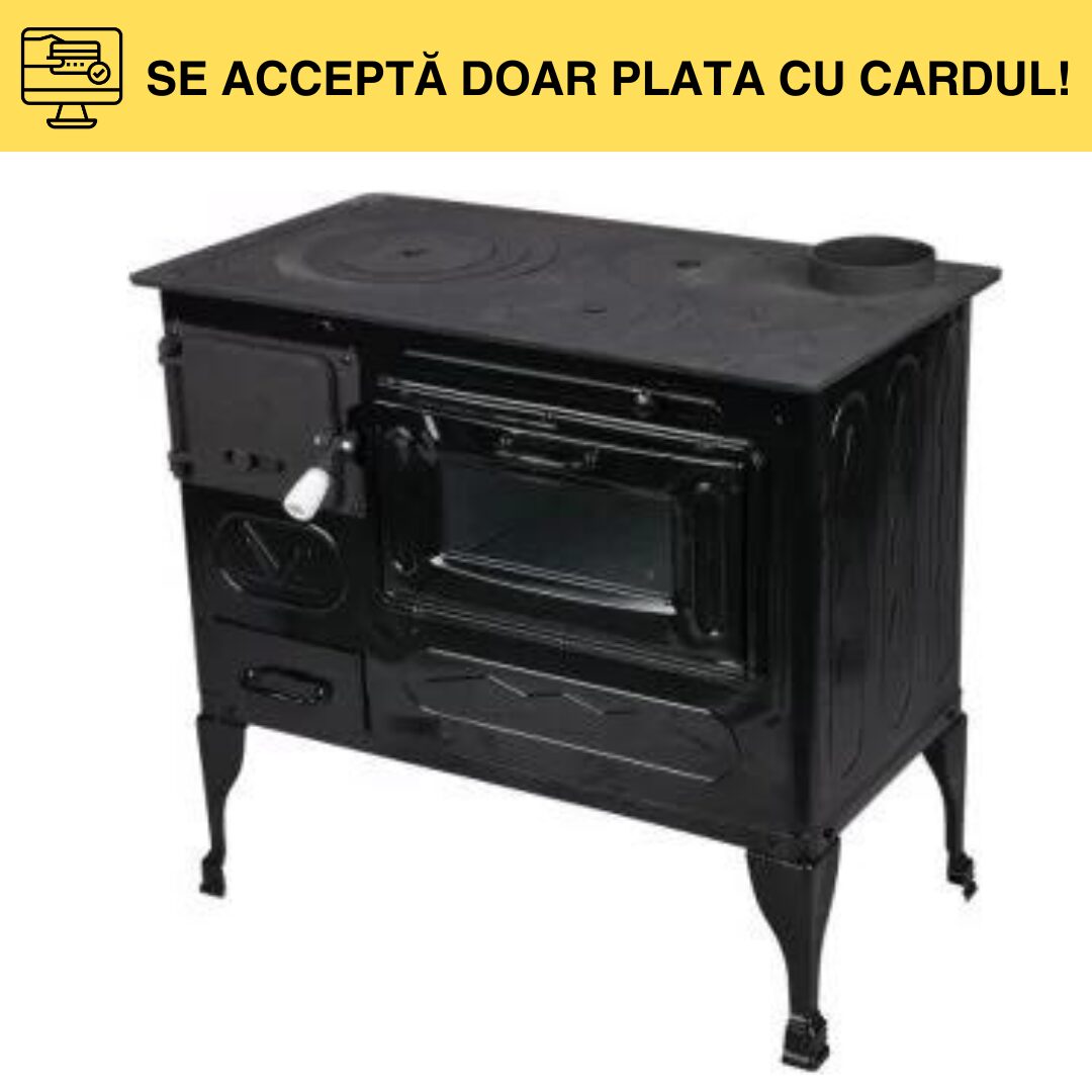 Soba este realizata din email, este samotata la interior si are plita din fonta cu 3 ochiuri si cuptor (pe dreapta sau stanga ).