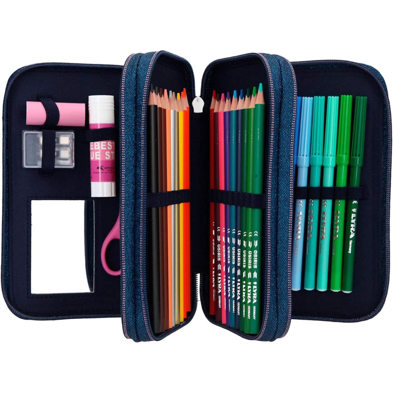 Penarul este complet echipat: 18 creioane colorate, 18 carioci, rigla, ascutitoare, radiera si lipici!